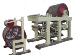小型造紙機齒輪傳動,由齒輪傳動或由毛布帶動若干個烘缸為一組,若干組烘缸構(gòu)成干燥部。各組烘缸的線速度可以分別調(diào)整,保持各組烘缸之間微量速差以補償紙頁在干燥過程中的收縮。出干燥部的紙頁干度一般在92~94%左右。在干燥部末端,一般配有冷缸,使水氣能在冷缸面上凝聚。冷凝水可以濕潤紙頁表面以利于在整飾中得到較佳的表面平滑度。烘缸直徑以1.5m的效果。單面光紙可以通過采用高硬度、高光潔度缸面的大直徑烘缸而得到較高的單面光澤度,大直徑烘缸直徑一般采用3~7.5m。